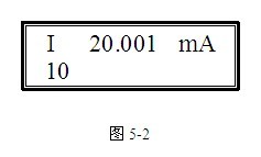 B、将标准信号源调节为输出20mA,然后连续按压力校准触摸键4下,此时显示屏第二排显示的当前校准点M应该为10(如果不是,通过多次按电流测量键可切换到10),第一排显示的数值为当前信号需修改的示值,按下电池电压键即把当前信号值记入校准系统中;如图5-2